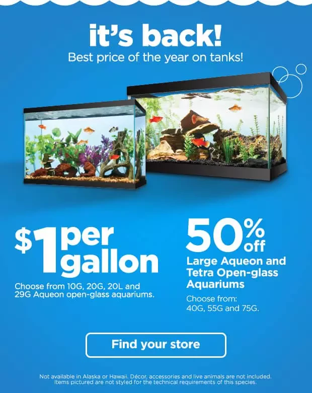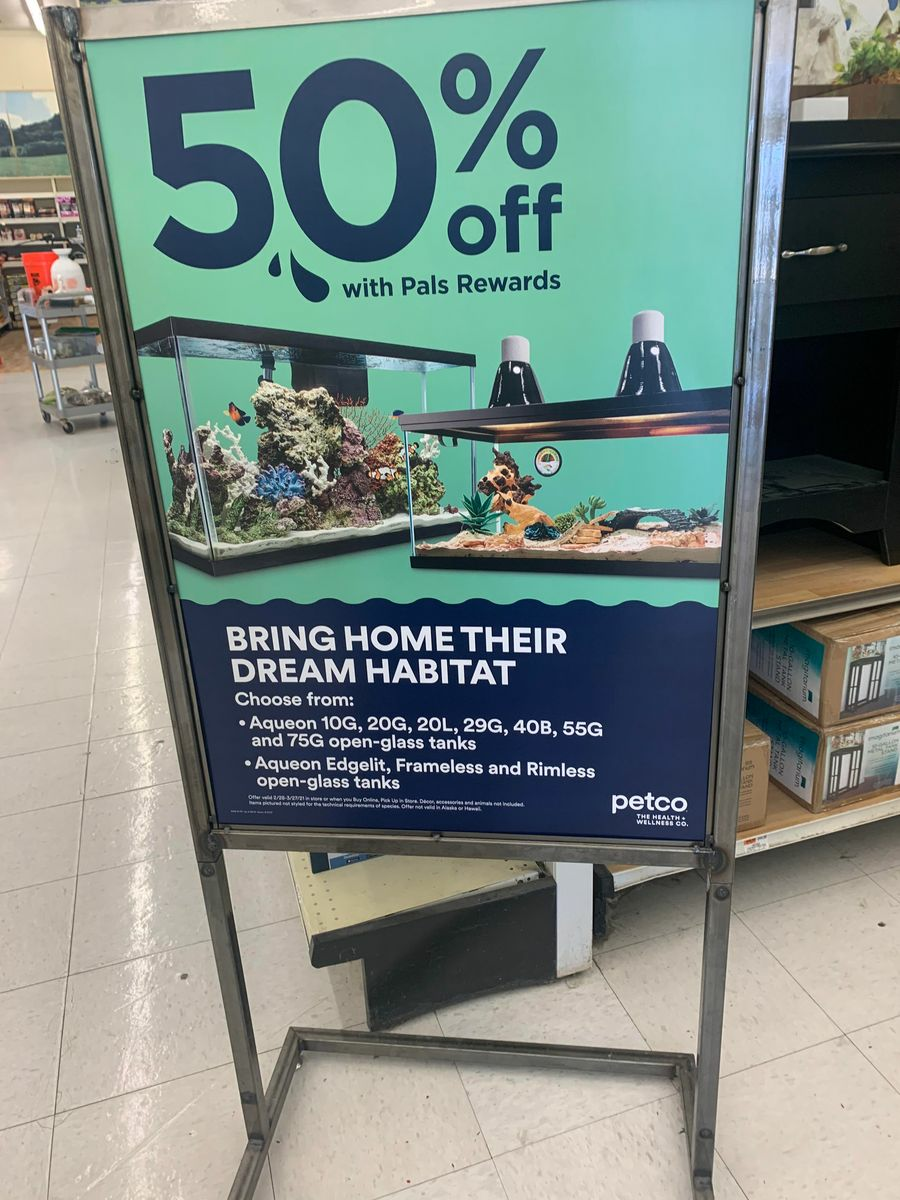In more recent years it appears that other major retailers including Petsmart are also incorporating this sale event into their marketing for Aqueon, and sometimes their own branded tanks as well. This may or may not be due to the fact of many of these retailers have a price match guarantee, in which they will match the price of an item if it is the same brand and same size (and due to how popular open tanks are, they are forced to follow their policies). Check with your local retailer to see if they have such a guarantee since it is a great way to score one of these tanks if a Petco is not located near where you live.