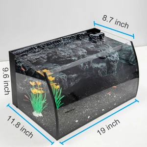 hygger Horizon 8 Gallon LED Glass Aquarium Kit for Starters includes one 7W 110GPH internal power filter pump, one colored led aquarium light, one 8 gallon glass tank with a decorative 3D rockery mountain background. The 3D background makes the whole aquarium looks cool like a dream word underwater, is a great rest, play spot, shelters for little fish. Also you can plant some green grass on the rockery mountain. Tank size is 19" L x 11.8" W x 9.6" H. This glass fish tank has a unique convex arc curve shape, can widen your view on the aquarium, and can hold more capacity of water. The total tank volume is 8 gallon, it can hold 6 gallon of water, because the tank has a nondetachable 3D background decor. When it holds full water, the whole tank weighs about 68 pounds. No required or custom tank stand, as there are cushion pad(s) stuck on the bottom to create a leveled tank no matter what location you wish to have it at.