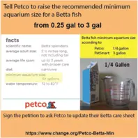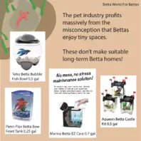 The tiny Betta cubes and fish bowls are misleading consumers into viewing them as appropriate long-term living situations for Bettas. These tanks only meet the bare minimum of keeping a fish alive. The pet industry has a responsibility to teach consumers proper Betta care!